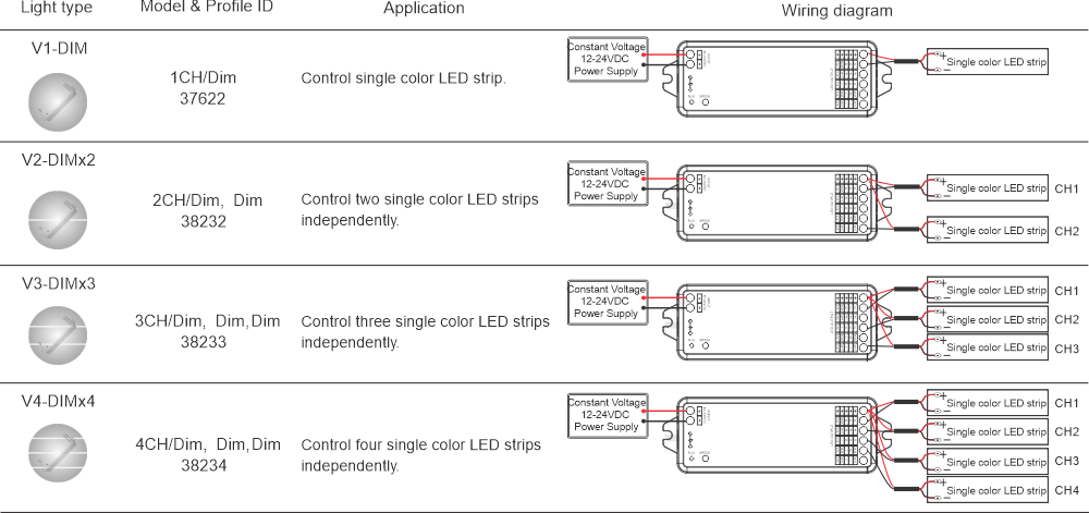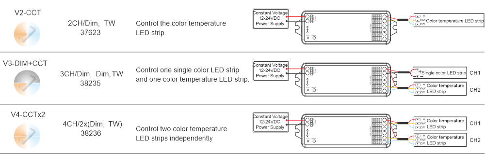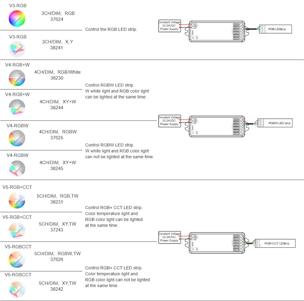 Single colour, CCT (dual colour), RGB, RGBW and RGBCCT LED strip can all be operated by this one receiver. With a current rating up to 15A it can operate most LED strip light applications. If a higher load is required, we recommend using a Power Amplifier or multiple receivers.