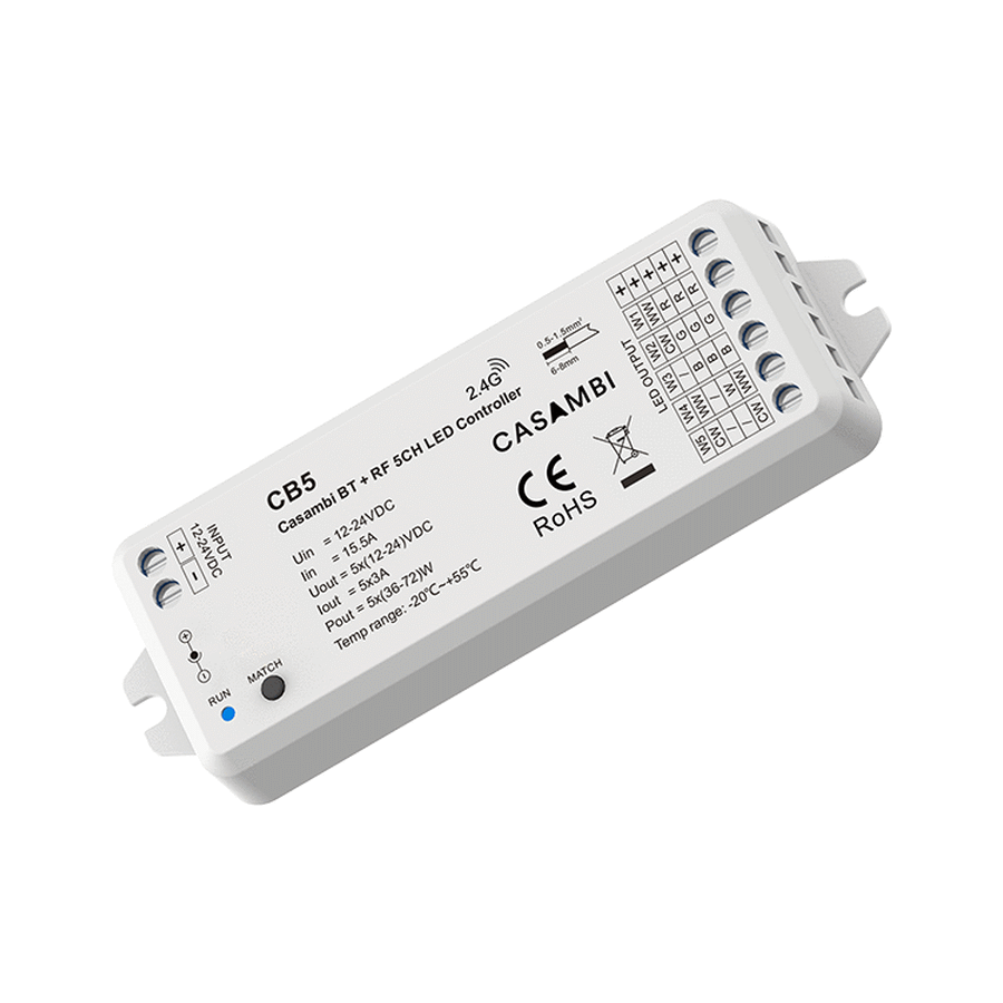 This little device allows any type of 12 or 24V LED strip to be controlled using the Casambi environment. It also allows control using a handheld remote as well as a wireless wall plate.